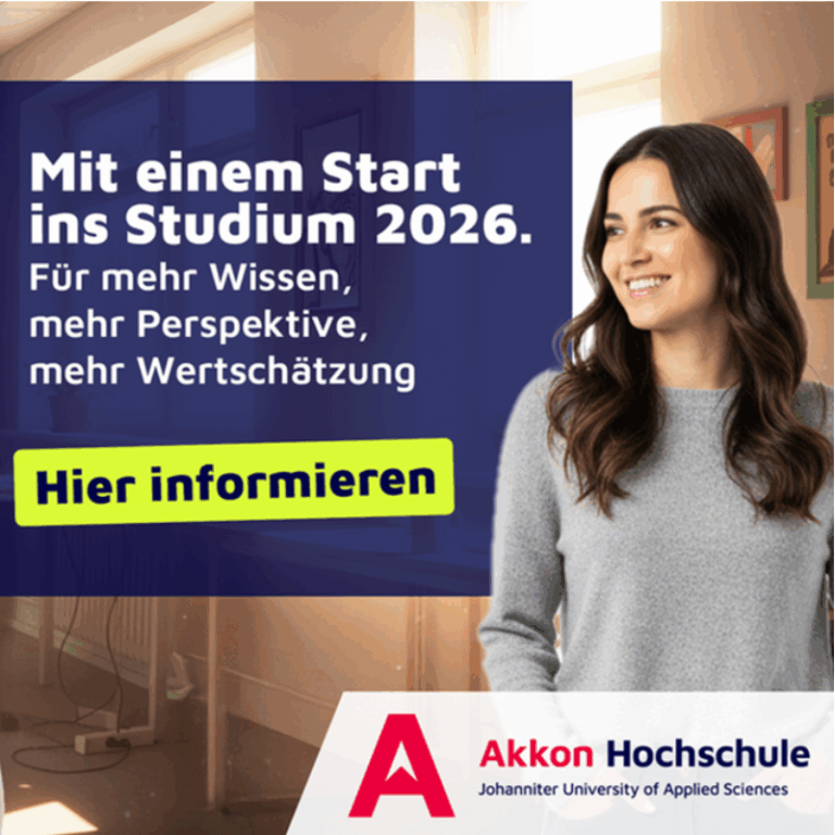 Ein berufsbegleitendes Studium an der Akkon Hochschule bietet Ihnen die Chance, Ihre wertvolle Berufserfahrung mit akademischem Wissen zu verbinden – praxisnah, flexibel und zukunftssicher. Es ist keine Pause vom Alltag, sondern ein Schritt nach vorn: eine Investition in Ihre Karriere und Ihr Wohlbefinden.